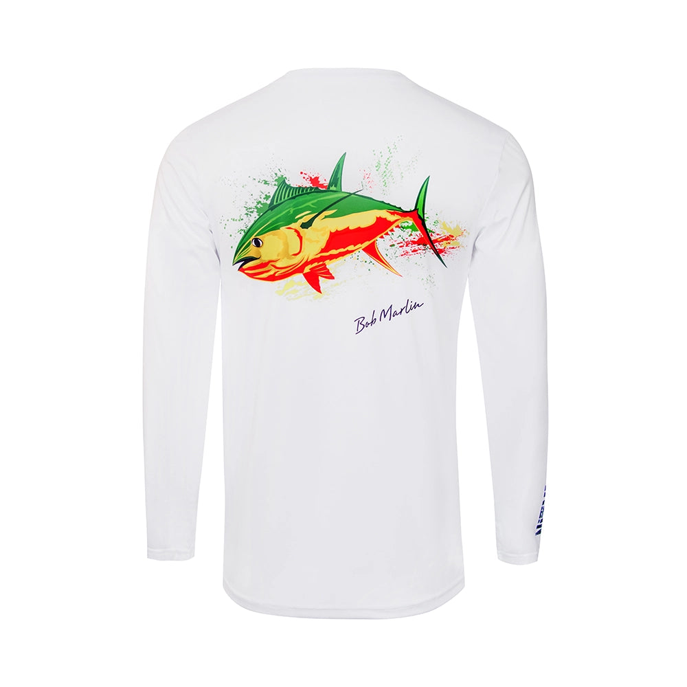 Elevate your fishing experience with the Rasta Tuna Performance Shirt – a fusion of style and functionality. This iconic image was taken on one of the #BobMarlinTeam fishing trips, and a tattoo artist created the Rasta inspired artwork of the picture.